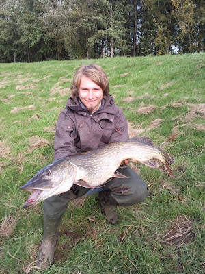 Gleich beim ersten Besuch von Hendriks neuem "Hausgewässer" (immerhin noch eine 3/4 Stunde Fahrt) ging dieser 16 Pfund schwere Hecht auf meinen Köderfisch. Beim Biss waren wir garnicht anwesend, da wir mit Gummifischen bewaffnet etwas Stromab gegangen sind. Hendriks Vater rief dann, dass wir mal eben kommen sollten. Als wir da waren lag die Pose unspektakulär an derselben Stelle nur etwas unter der Oberfläche. Reichlich Treibgut gesellte sich zu der Montage und schwamm in die Schnur. Ich nahm Tuchfühlung auf. War da überhaupt noch ein Fisch am Haken? Anschlag! Haken sitzt fest! Keine Zeit zu überlegen, ob die Montage im Treibgut festsitzt oder an einem Fisch. Er zieht direkt in die nicht sehr schwache Hauptsrömung des Flusses. Mit aller Kraft die das Gerät zulässt halte ich dagegen (360cm Posenrute, Wg: 40gr, 25er mono). Nach mehreren harten Flüchten lässt er sich etwas kontrollierter drillen aber aus dem Nichts gab er nochmal richtig Gas und sprang in voller Länge aus dem Wasser. Was für ein Anblick! Da war uns klar, dass es ein Kapitaler Hecht ist der da gebissen hat. Mit dem Gaff ging Hendrik an die Steinschüttung und wartete bis ich den Fisch nah genug an ihn heran bugsiert habe. Fachmännisch entnahm Handrik den Kapitalen seinem Element und die Freude war groß als wir das Prachtexemplar vor uns sahen. 107cm, 8 Kilo. Ein herrliches Tier, welches mir noch den heißumkämpften größten Hecht in der Mästerskapen beschert hat. Ach ja, die Saison ist ja noch garnicht vorbei...